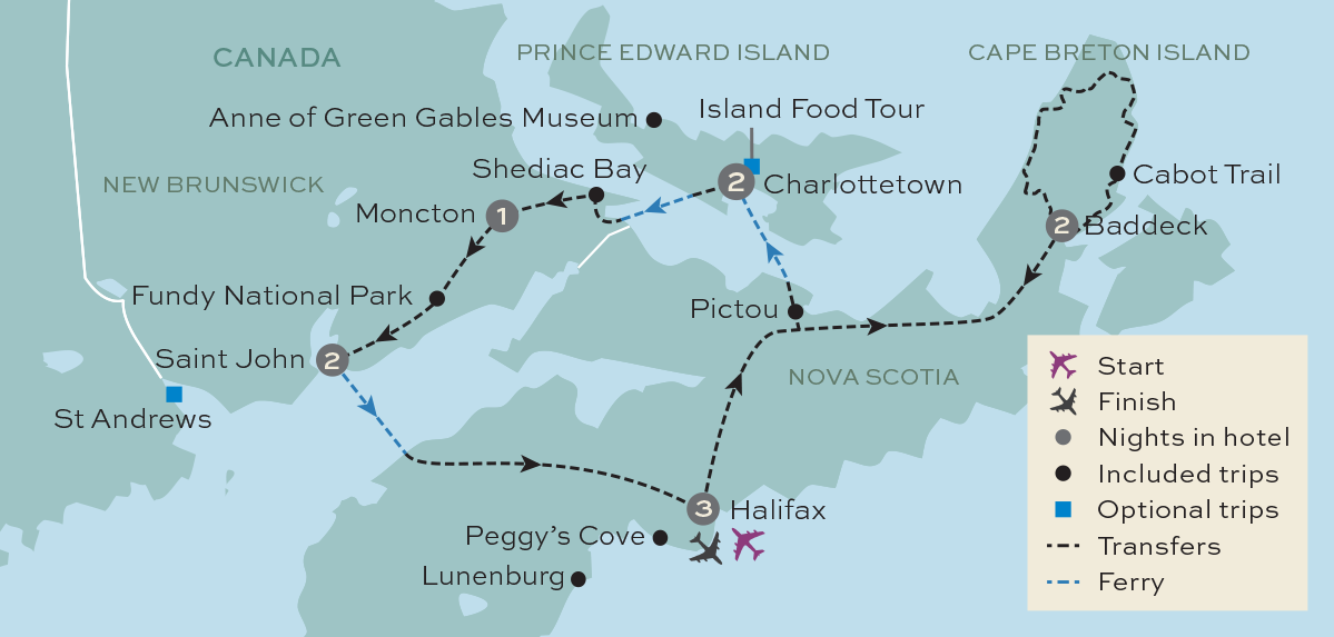 Get ready to fall head over heels for Canada's Maritime provinces of Nova Scotia, New Brunswick and Prince Edward Island. The provinces are home to incredible scenery - from the world's highest tides, rocky coves, sandy beaches, remote lighthouses, and fishing heritage towns. Together, we'll journey through some of North America's most captivating landscapes. We'll explore UNESCO-listed Lunenburg's candy-coloured waterfront, travel the legendary Cabot Trail through Cape Breton's dramatic highlands, and hop across to charming Prince Edward Island, birthplace of Canada itself. Along the way, we'll share a traditional lobster lunch, dance at a Cape Breton Ceilidh, and uncover fascinating stories from Halifax to Saint John. History, nature, culture and coastline — this tour has it all. With incredible scenery at every turn and warm Maritime hospitality, this is one adventure we'll be talking about for years.