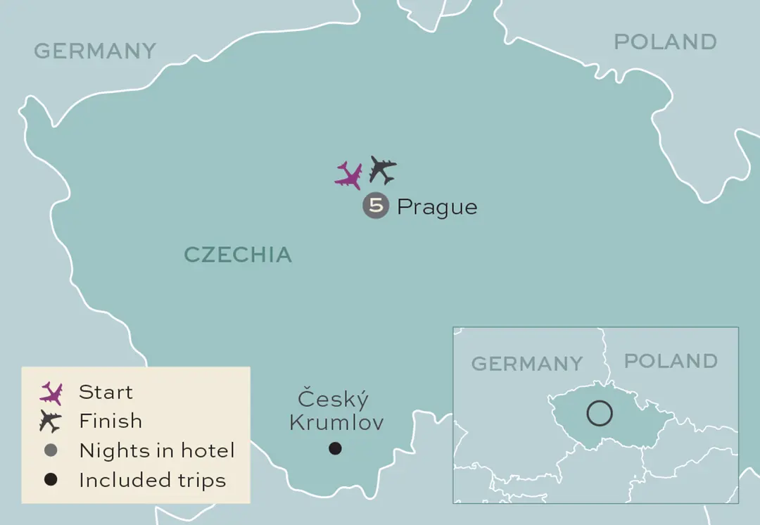 Today, you will fly to the capital of the Czechia, Prague, where we'll transfer you to your hotel which is located a moment's walk from the UNESCO-listed Old Town. Get to know your travelling companions over a welcome drink before dinner this evening.