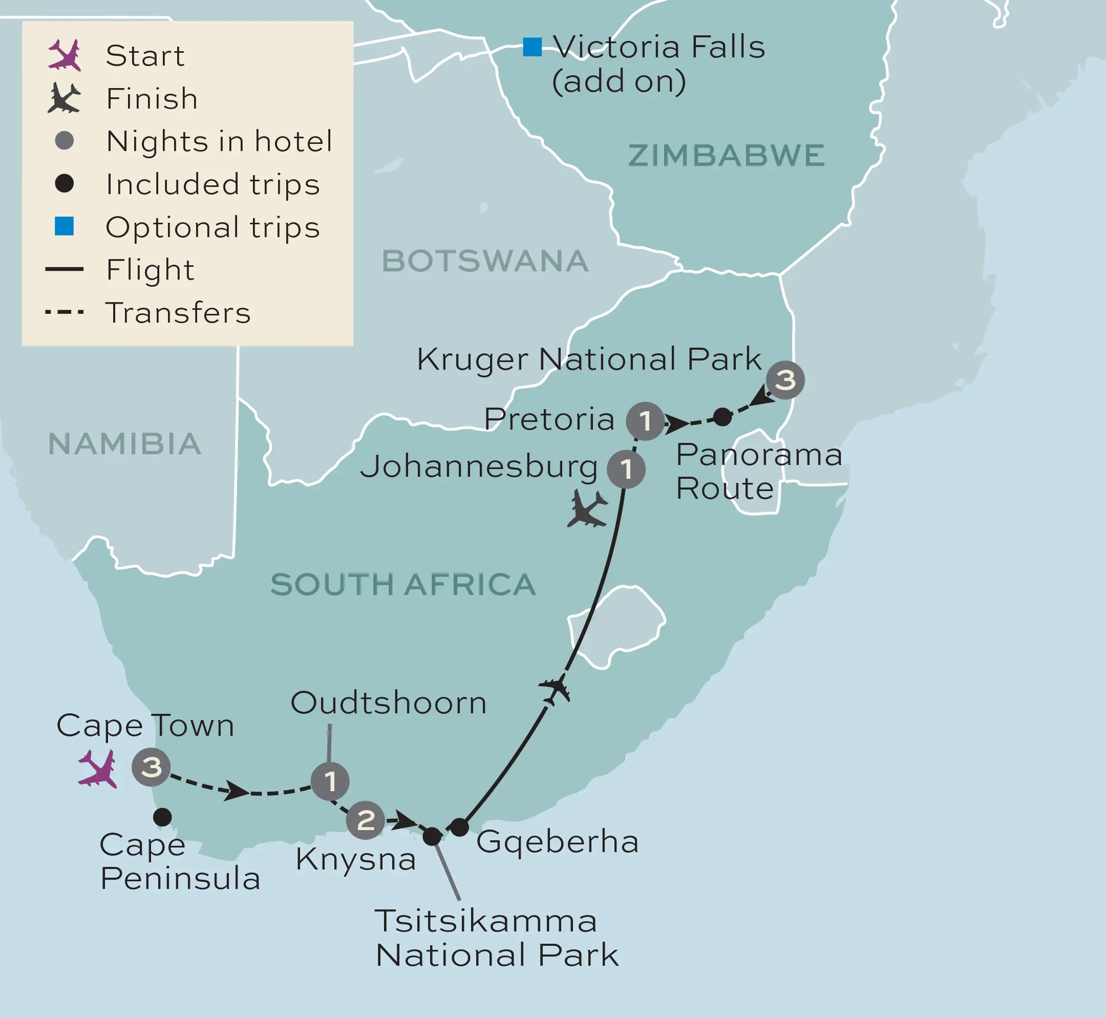 This fabulous South African adventure starts in cosmopolitan Cape Town, where you'll have the chance to ascend Table Mountain and enjoy a tour of the Cape Peninsula. The highlights keep on coming as we visit Oudtshoorn and Knysna, and then drive along the spectacular Garden Route, taking in Storms River Mouth on our way to Port Elizabeth. From here we'll fly to Johannesburg, before travelling along the scenic Panorama Route to the Greater Kruger Area. Here we'll go on safari in search of the 'Big Five', the perfect end to an unforgettable time in South Africa. Complete this incredible adventure with a visit to awesome Victoria Falls where you'll enjoy a fabulous Boma Dinner & Drum show, a guided tour of the Victoria Falls and a sunset cruise along the Zambezi River.