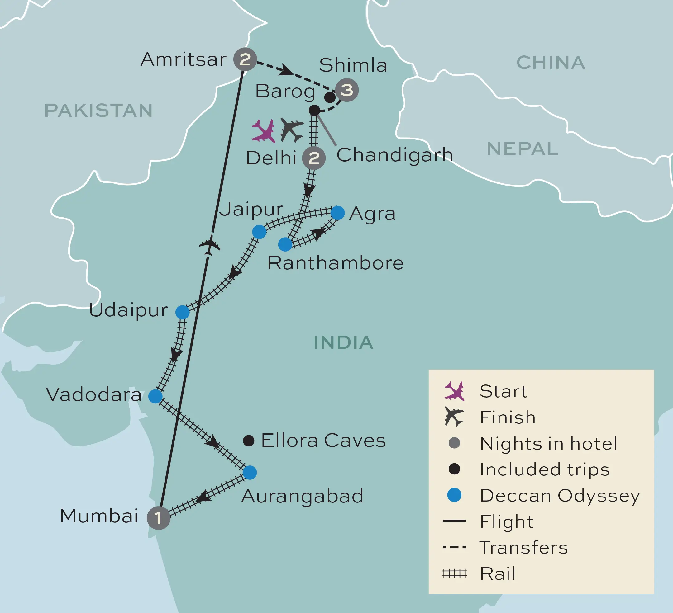 • 8 nights in 5 star hotels, 7 nights on a luxury heritage train and 1 night in flight
