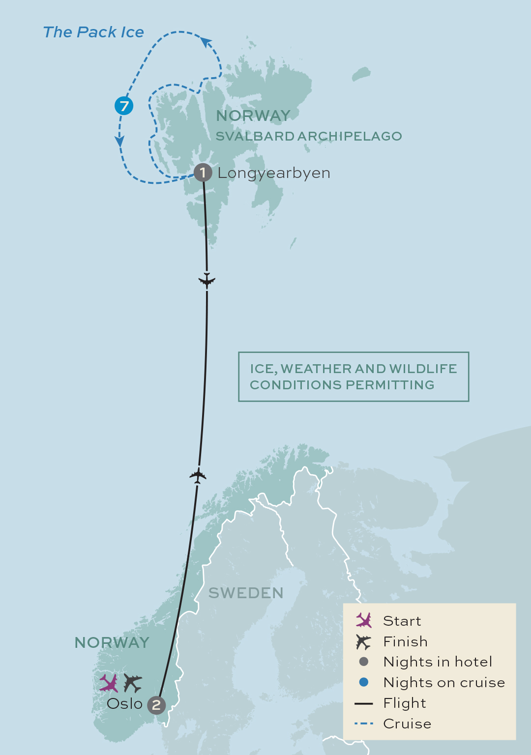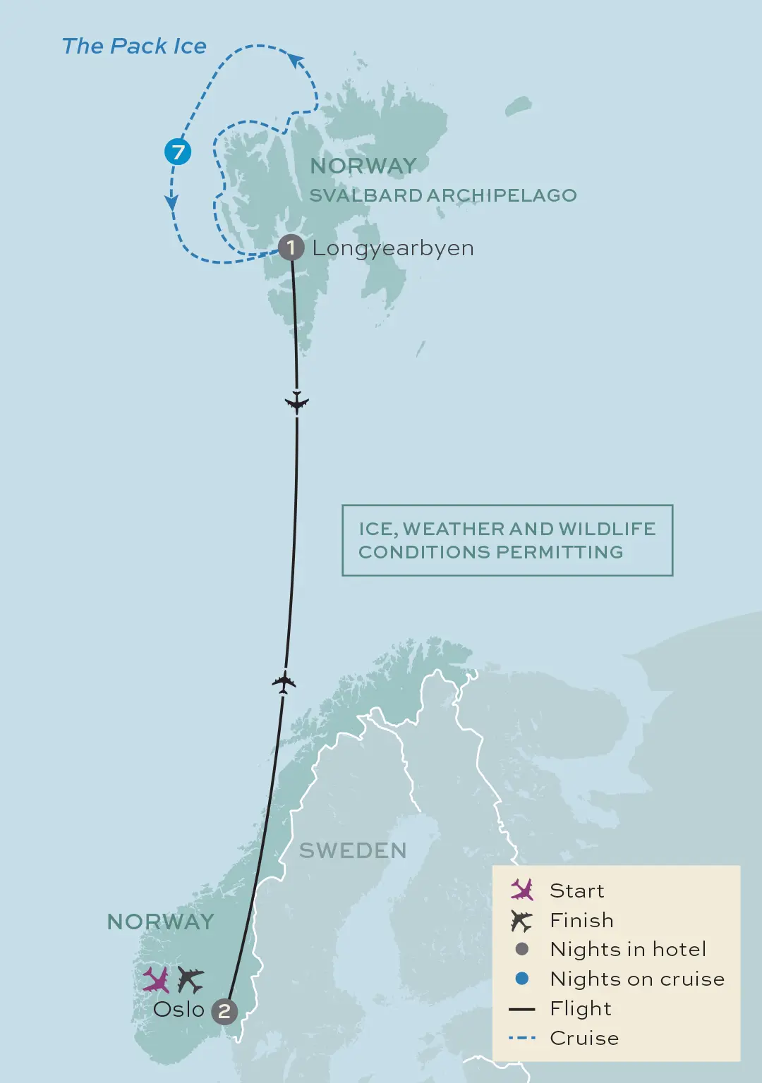 Our six-day polar expedition unfolds across one of Earth's most pristine wilderness areas. Navigate through ice-laden seas, penetrate deep fjords framed by breathtaking mountain scenery, and witness massive glaciers cascading dramatically into the ocean. Our flexible itinerary explores Svalbard's stunning coastline, and the expectation is we’ll explore Ny-Ålesund, Bellsund, Hornsund, and Northwest Spitsbergen National Park - though each day adapts to ice and weather conditions for optimal experiences. From the ship's deck, marvel at the everchanging seascape of sea ice, fjords leading to thundering glaciers, and sculptural icebergs. Wildlife encounters create unforgettable memories – watch for elusive Arctic foxes, hardy Svalbard reindeer, marine mammals, and the region's ultimate prize, the magnificent polar bear. Your expedition team strategically positions the ship near towering cliffs where seabirds nest in thousands, and along continental edges where nutrient-rich waters attract whales. With only 128 passengers aboard, the Expedition Ship accesses remote areas larger ships cannot reach. This could mean venturing deep into glacier-fed fjords or cruise the ice edge in sturdy Zodiacs, bringing you remarkably close to seals and walruses in their natural habitat. The goal is two off-ship experiences daily - whether landing ashore to explore historical sites and tundra landscapes, or Zodiac excursions revealing Arctic secrets up close. Your onboard expedition team comprises passionate specialists in ornithology, marine biology, glaciology, and polar history. These experts lead every Zodiac adventure and deliver captivating lectures, sharing their deep knowledge through engaging educational programs that enrich your understanding of this extraordinary environment.